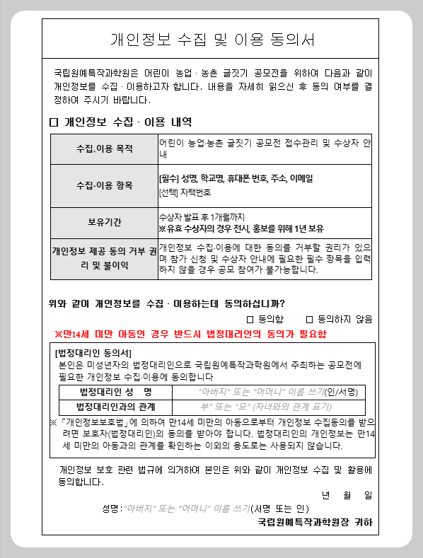 농촌진흥청 국립원예특작과학원에서 개최하는 제16회 어린이 농업·농촌 글짓기 공모전이 열립니다!