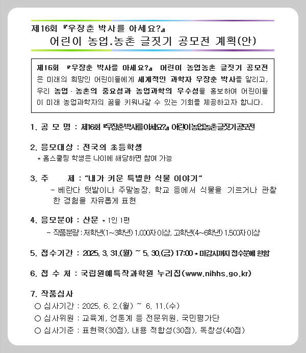 수상자 발표 : 2025년 6월 20일(금), 국립원예특작과학원 홈페이지 및 해당 초등학교 공문 발송