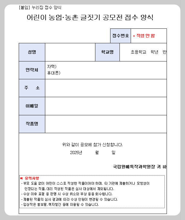 🎨 직접 작성한 글과 함께 접수 양식, 개인정보동의서, 작품 제출 양식도 잊지 말고 꼼꼼히 확인해서 접수해 주세요!