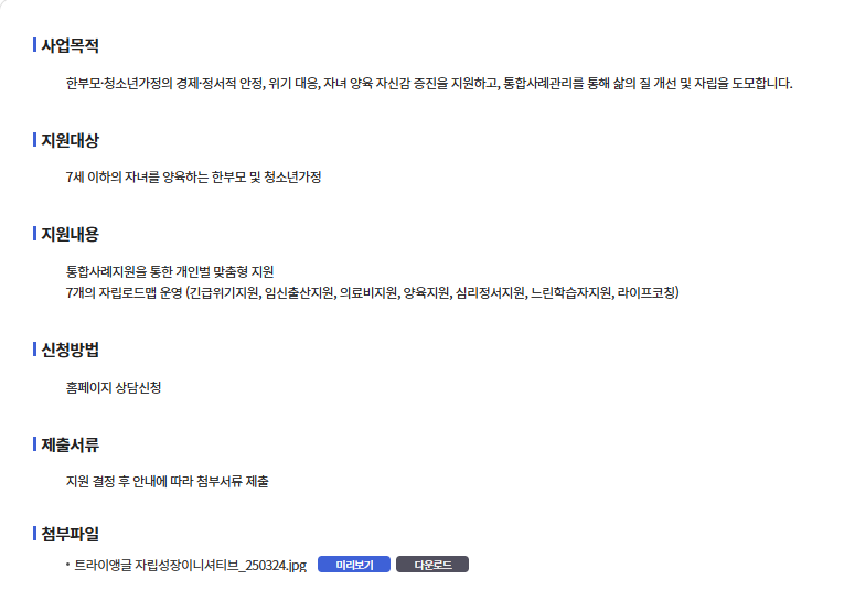 - 사업명: 한부모가족 지원사업 '트라이앵글 프로젝트'