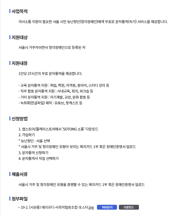 • 지원 대상: 서울시 거주 농인(청각장애인)