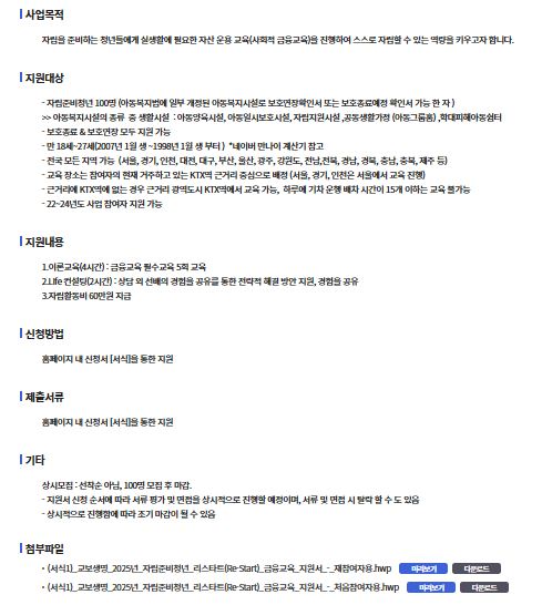μ립μ μ€λΉνλ μ²λ λ€μκ² μ€μνμ νμν μμ° μ΄μ©κ³Ό μ¬λ¬΄κ΅μ‘(κΈμ΅κ΅μ‘)μ μ§ννμ¬ μ€μ€λ‘ μ¬μ μ μ립μ μ΄λ£° μ μλ μλμ κΈΈλ¬μ£Όλ κ²μ λͺ©νλ‘ ν©λλ€.