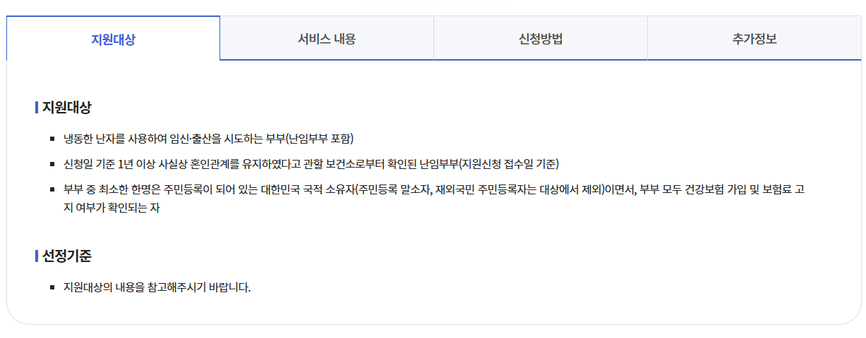 조건 요약 ①혼인 1년↑ ②대한민국 국적 ③건강보험 가입 ④본인 난자 사용